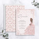 A beautiful blush pink and rose gold glitter confetti illustrated girl Quinceañera birthday party invitation. "Quinceañera" is written in a beautiful, delicate hand lettered script, on a background of blush pink. A beautiful girl in a gorgeous pink gown with rose gold sparkles, jewellery and tiara appears bottom right, and rose gold glitter confetti falls from the top, and the whole scene is bordered by a rose gold glitter floral frame. The back of the invitation features a blush pink and rose gold shimmer brocade. So gorgeous! Copyright Elegant Invites, all rights reserved.