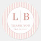 This Classic Round Sticker features a sophisticated design with vertical pink and white stripes framing a central circle. The bold, serif font displays the initials "L" and "B," separated by a thin line, while the phrase "THANK YOU" is elegantly centred below in smaller text. The soft pink and muted beige colour palette creates a warm and inviting atmosphere, perfect for expressing gratitude at special occasions. Its minimalist layout and customisable date make it ideal for personalising gifts or events.