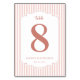This elegant wedding table card features a soft pink and white striped background, creating a subtle yet sophisticated backdrop. Dominated by a large, stylised number "8" in muted rose colour, the design is framed by an ornate border with decorative notches at each corner, adding vintage charm. The typography includes a delicate cursive script for "table" and clean serif fonts for customisable names and date, ensuring readability and personalisation. Perfect for formal celebrations, this card exudes a classic and refined aesthetic, ideal for setting a serene and inviting mood at your special event.