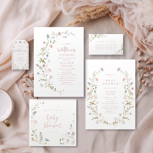 Elegant delicate watercolor wildflower wreath frames your event details in dusty pink. Pastel palettes of soft blush pink, off white, beige, dusty blue, and botanical greenery, Great floral Baby Shower invitations for modern rustic party, boho country garden party in spring and summer.
