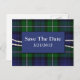 Elegant wedding save the date post card done in the traditional Forbes green and blue tartan plaid. Lovely graphics of a double strand of pearls, with a blue plaque and white text decorates the plaid pattern. All text, on the front plaque and back side of the card, is fully customisable to read what you want.