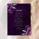 This elegant wedding menu features plum floral bouquets set off with silver faux foil greenery in two corners, on a background image of purple watercolor agate. The customisable text combines silver grey serif and handwriting fonts. The reverse side features a matching purple and silver floral and agate design.