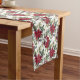 A pretty red and green poinsettia bouquet is embellished with seasonal greenery and red berries to make a pattern across this festive Holiday table runner.