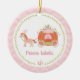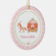 Decorate the little girls room with this personalised ornament. It features a horse pulling on a pumpkin style carriage that is decorated with lots of floral elements. A decorate wreath surrounds the design. Pink zigzag chevron for background. Personalise with the little girls name. Great for the autumn fall season!