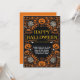 The bold typography reading “Happy Halloween” immediately sets the festive tone for your costume party, haunted house gathering, or autumn celebration. Whether you’re planning a fun night for kids or a classy masquerade for adults, this invitation design captures the spirit of Halloween with sophistication and charm.