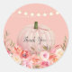 Sweet pumpkin sitting behind a floral bouquet of pink, coral and yellow on a blush pink background with string lights above. "Thank You" text on pumpkin.