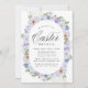 Elegant Easter brunch invitations featuring your brunch details surrounded by an oval frame of pastel violet purple and blue flowers with lush green leaves. The floral Easter invites reverse to display a solid light purple colour background.