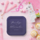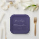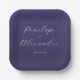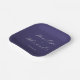 This elegant wedding plate features a sophisticated design with a deep purple background and light cream text. The layout is minimalistic, showcasing two names in an elegant cursive script connected by the word "AND" in uppercase letters, followed by a date in a clean sans-serif font. The typography creates a refined balance, emphasizing formality and timelessness. Perfect for formal occasions, this plate combines understated elegance with customisable elements, making it ideal for weddings or special celebrations.