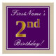This simple and elegant birthday party poster design features a personalised message like "FirstName’s 2nd Birthday!" (with the "2nd" having a faux/imitation gold-like colouring look) within a purple-coloured square area featuring a simple border outline. The name is in an elegant white-coloured script-like text, and can be personalised. A personalised birthday party poster like this could perhaps be used as a decoration at a party being held for somebody who is celebrating their second birthday. [~Z0000238]