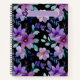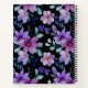 The design features delicate watercolor flowers in shades of purple and lavender, set against a deep black background for a striking contrast.
