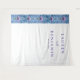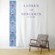 This elegant wedding backdrop features a split design with a vertical floral pattern on the left, showcasing stylized purple flowers and swirling blue leaves against a soft blue background. The right side offers a clean white space with customizable text in an elegant serif font, perfect for personalizing with names and dates. The classic and sophisticated style combines romantic florals with crisp typography, creating a balanced aesthetic ideal for formal celebrations. Its mood of elegance and anticipation makes it a beautiful addition to any wedding setting.