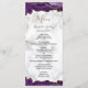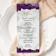 This elegant, modern wedding menu features top and bottom borders of purple watercolor agate trimmed with gold faux glitter. The text appears in elegant gold-coloured handwriting script and black italic and copperplate fonts on a grey and white marble background. The agate design is repeated on the reverse.