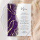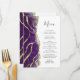 The left-hand edge of this elegant modern wedding menu features a purple alcohol ink border trimmed with faux gold foil and faux glitter. The customizable text combines handwriting script and copperplate fonts in charcoal gray on a white background. The reverse side features a matching purple and gold design.