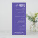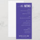 This elegant wedding menu features a deep purple background with crisp white text, creating a sophisticated and formal atmosphere. The layout is clean and structured, with distinct sections for starters, salad, main course, and dessert, each highlighted by clear headings in an uppercase sans-serif font. An elegant script font introduces the title "the MENU," adding a touch of whimsy to the minimalist design. Customizable placeholders allow personalization for names and dates, making it perfect for a memorable event. The overall mood is refined and inviting, ideal for celebrating a special occasion like a wedding.