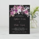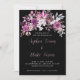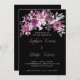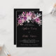 This elegant wedding invitation features a striking black background, providing a dramatic and sophisticated foundation for its exquisite autumnal floral design. At the top, an array of fall wedding flowers, including dark purple roses and dainty white blossoms, is beautifully arranged, interwoven with lush green, purple, pink, white, and brown foliage. This combination brings a touch of seasonal charm and sophistication to the invitation, making it perfect for couples seeking a blend of elegance and rustic beauty.