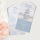 This design features a QR code dusty blue floral rsvp all in one wedding invitation, with a website reply online template, perfect for guest response with a scan scannable code, an elegant classic classy modern minimal style, simply add your URL link address, stylish calligraphy script ampersand, romantic garden rose flower greenery, minimalist minimal QR code generator, trendy trifold on a budget, with simple guest information details info