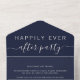 Elegant dark navy blue and light cream elopement or private wedding announcement and wedding reception invitation. "Happily Ever After Party" is written in a mix of simple typography and a stylish script with swashes. Input your wedding website URL address to create a QR code for your guests to RSVP online and obtain information on accommodations, directions, any night before parties and other details. A tear away RSVP postcard provides a convenient envelope-free response from your guests that prefer to RSVP by mail.
