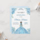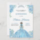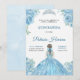 Quinceañera invitation with a blue floral border, featuring a girl in a blue gown. Front details the event; back is a plain light blue.