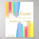 Beautiful rainbow wedding party gold foil welcome sign with pretty, artistic paint strokes full of bright colour. This colourful decor is perfect for an artistic couple or a gay and lesbian reception. The cheerful watercolor print features charcoal grey text that reads Welcome to our Wedding.