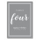 This design was created for smaller intimate wedding celebrations. Simple, minimalist and elegant Wedding Table Number FOUR design features a contemporary design with a double frame border in crisp white on a sophisticated ultimate grey background. The chic design provides timeless yet modern sophistication.   Personalise wedding table design with your wedding details in crisp white lettering and script. The back of the card is a duplicate of the front. Order one for every table with the individual table numbers.