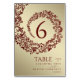 This wedding table number card radiates luxury and charm with its ornate damask frame in striking red and gold tones. The decorative damask border forms a graceful circular design, surrounding the bold table number at the centre. The heading “Table” is written in flowing calligraphy, balancing the bold number typography with a refined and romantic touch.