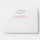 Elegant holiday envelope featuring "JOY" with the letters "J" and "Y" in a red sans serif font and a watercolor painted greenery wreath as the letter "O". Below is your return address. These custom envelopes are a great way to add a personal touch to your Christmas cards and make preparing them for the mail faster and easier. Coordinating items available in the complete collection. If you need assistance finding it, feel free to send me a message.