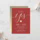 Simple calligraphy, elegant red engagement party invitation with cute faux gold heart and full names monogram at back.