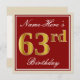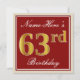 This simple and elegant birthday party invitation design features a personalised message like "Name-Here’s 63rd Birthday" (with the "63rd" having a faux/imitation gold-like colouring look) within a red-coloured square area featuring a simple border outline. The name is in an elegant white-coloured script-like text, and can be personalised. The back features personalised invitation details. A birthday party invitation like this could perhaps be used when inviting people to a birthday party being held for somebody who is celebrating their sixty third birthday. [~Z0000227]