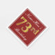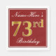 This simple and elegant paper napkin design features a message like "Name-Here’s 73rd Birthday" (with the "73rd" having a faux gold-like colouring) within a red-coloured square area featuring a simple border outline. The name is in a white-coloured script-like text, and can be personalised. Napkins like these could perhaps be used at a birthday party for somebody who is celebrating their seventy third birthday. [~Z0000138]