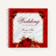 This elegant budget wedding guestbook spiral notebook features a faux red metallic background, white satin, and a gold filigree jewelled frame combined with rich red roses, with elegant script, and the names of the bride and groom with the wedding date.