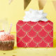 This wrapping paper features elegant faux gold foil scallop pattern on red background.