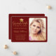 This personalised college photo graduation announcement features your photo with a modern red maroon rounded border. On the left in faux gold script is the word "Graduate" accented by a gold graduation cap with your name, degree, school, year, and date to personalise. Designed by Susan Coffey.
