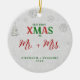 An elegant, white, red and green Christmas ornament for a newlywed couple with the title "our first Christmas as Mr and Mrs", featuring a pine tree and snowflakes covered in rhinestones and glitter (these are digital effects, not real stones or glitter!) and a shimmering, white winter background. The word XMAS, covered in rhinestones (digital also!) is a play on the traditional green and red. Modern, simple and elegant.