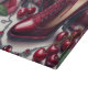 Vivid red high-heeled shoes accompanied by cherries and ornate jewellery, placed on a chequered fabric backdrop