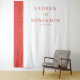 This wedding backdrop features a minimalist design with a striking vertical split. The left side showcases a textured red panel with intricate leaf or feather patterns, while the right side offers a clean white background for contrast. Elegant typography in serif and script fonts highlights the names, creating a sophisticated yet simple look. The warm color palette of reds and whites evokes feelings of love and celebration, making it perfect for a romantic wedding setting.