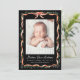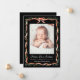 Announce your little one’s arrival with this holiday-themed birth announcement featuring a vertical baby photo framed by hand-painted red ribbon and watercolor greenery on a black background. The baby’s name is displayed in whimsical white script with birth stats shown below, creating a bold and modern design perfect for Christmas or winter announcements. The reverse side features a second photo with space for a short message, offering a stylish and memorable way to share your joyful news with family and friends.