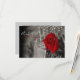 A lovely, classic wedding RSVP card that features a single red rose in a bouquet accompanied by baby's breath, against a soft monochrome black and white warm background, the rose being the only coloured element. This design matches my Elegant Red Rose Fade Out to Black and White wedding invitations available in my shop's Wedding category.