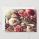 This elegant invitation features a vintage High Tea table setting with a red rose arrangement. There are also bone china teacups a lace tablecloth and a fancy red hat. Personalise this template invitation with your fancy red hat theme tea party information. Buy this red rose tea party invitation as a hard copy or as a digital download, the choice is yours. This invitation features an AI-generated image.