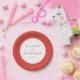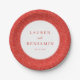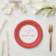 This elegant wedding plate features a rich, warm red background with intricate swirling patterns that add depth and movement. The design includes a centred circular element framed by white lines, showcasing classic serif typography for the names and a script font for "and," creating a formal yet intimate feel. The minimalist layout emphasizes clarity and sophistication, making it perfect for celebrating your special day. With its high contrast and stylish aesthetic, this plate is ideal for adding a touch of elegance to your wedding reception.