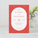 This elegant wedding invitation features a rich, deep red background adorned with intricate swirling motifs that create a textured appearance. The central oval frame showcases a clean and symmetrical layout with classic serif typography, enhancing the formal and sophisticated feel of the design. Customizable elements allow for personalization of names, dates, and locations, while the warm color palette and balanced composition convey an inviting and celebratory mood, perfect for commemorating a significant life event.