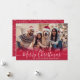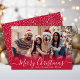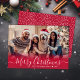 Modern Elegant Red White Snowflake Script One Photo Merry Christmas Script Holiday Card. This festive, simple, minimalist, cute whimsical 1 photo holiday greeting card template features „Merry Christmas” greeting text which is written in a hand lettered swirly swash-tail font calligraphy script photo overlay. On the back side cute white snowflakes or snowy background on red background. This Cute Custom Personalised Photo Christmas Cards are a great way to remind loved ones that you're thinking of them this Winter Holiday Season.