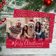 Modern Elegant Red White Snowflake Script One Photo Merry Christmas Script Holiday Card. This festive, simple, minimalist, cute whimsical 1 photo holiday greeting card template features „Merry Christmas” greeting text which is written in a hand lettered swirly swash-tail font calligraphy script photo overlay. On the back side with your greeting message template with a little heart doodle and one photo template red white snowflakes or snowy background. This Cute Custom Personalised Photo Christmas Cards are a great way to remind loved ones that you're thinking of them this Winter Holiday Season.