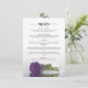 This beautiful wedding menu features a simple yet elegant design with a script calligraphy title and a single long-stemmed amethyst purple rose lying on its side reflecting in a pool of water.