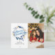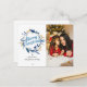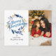 This elegant Christmas card features a wreath with golden reindeer and blue and grey greenery. Merry Christmas is written in a beautiful handwritten script. Personalise this card by adding photo, names and year.