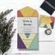 This modern wedding invitation is perfect for the couple that wants to make a stylish statement. The invitation features bold retro calligraphy on a white rectangle with a vibrant and groovy abstract geometric background. The artistic combination of old and new gives any event an inviting and unique touch. Whether you’re planning a simple gathering or a big celebration, this invitation will make sure your guests know it’s an occasion to remember.
