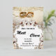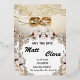 Elegant wedding invitation featuring intertwined gold rings on a delicate lace background, framed with floral decorations. The invitation announces the wedding of Matt & Clara, set for August 5, 2030, at 8:00 PM at Liceria Hotel, 123 Anywhere St. The design blends classic and romantic elements, making it perfect for a special occasion.