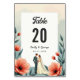 This elegant watercolor floral wedding table number is perfect for a modern wedding. The romantic design features an elegant watercolor floral frame with a bride and groom illustration and black calligraphy on a white background.