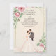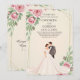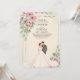 At the centre of the design, a charming illustration of a bride and groom standing together in a romantic garden setting adds warmth, love, and storytelling to the invitation. The soft colour palette and floral details make this design perfect for couples who want a dreamy, elegant, and memorable wedding theme.