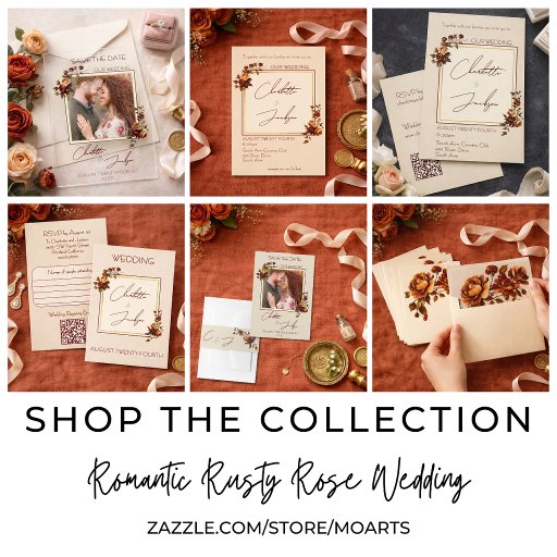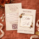 Elegant Romantic Rusty Rose Autumn Wedding RSVP Card. Invite your guests in style with one of our elegant and romantic fall wedding invitations and this RSVP card. The beautiful design features a delicate gold geometric frame accented by moody watercolor bouquets of burgundy and rust orange roses against a warm cream background. This exquisite stationery includes a convenient QR code registry and RSVP information on the back, making it perfect for modern couples planning a sophisticated autumn celebration.