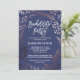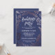 This elegant rose gold and navy bachelorette party invitation card is perfect for a classy event. The design features a stunning blush pink leafy frame on a dark blue background and is paired with a dazzling cursive font.